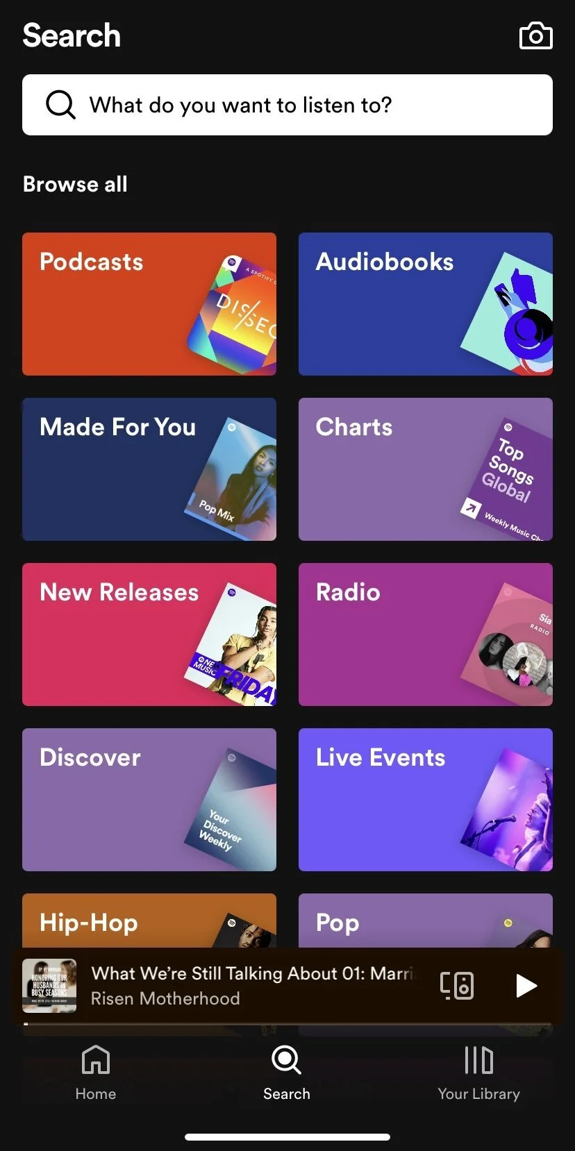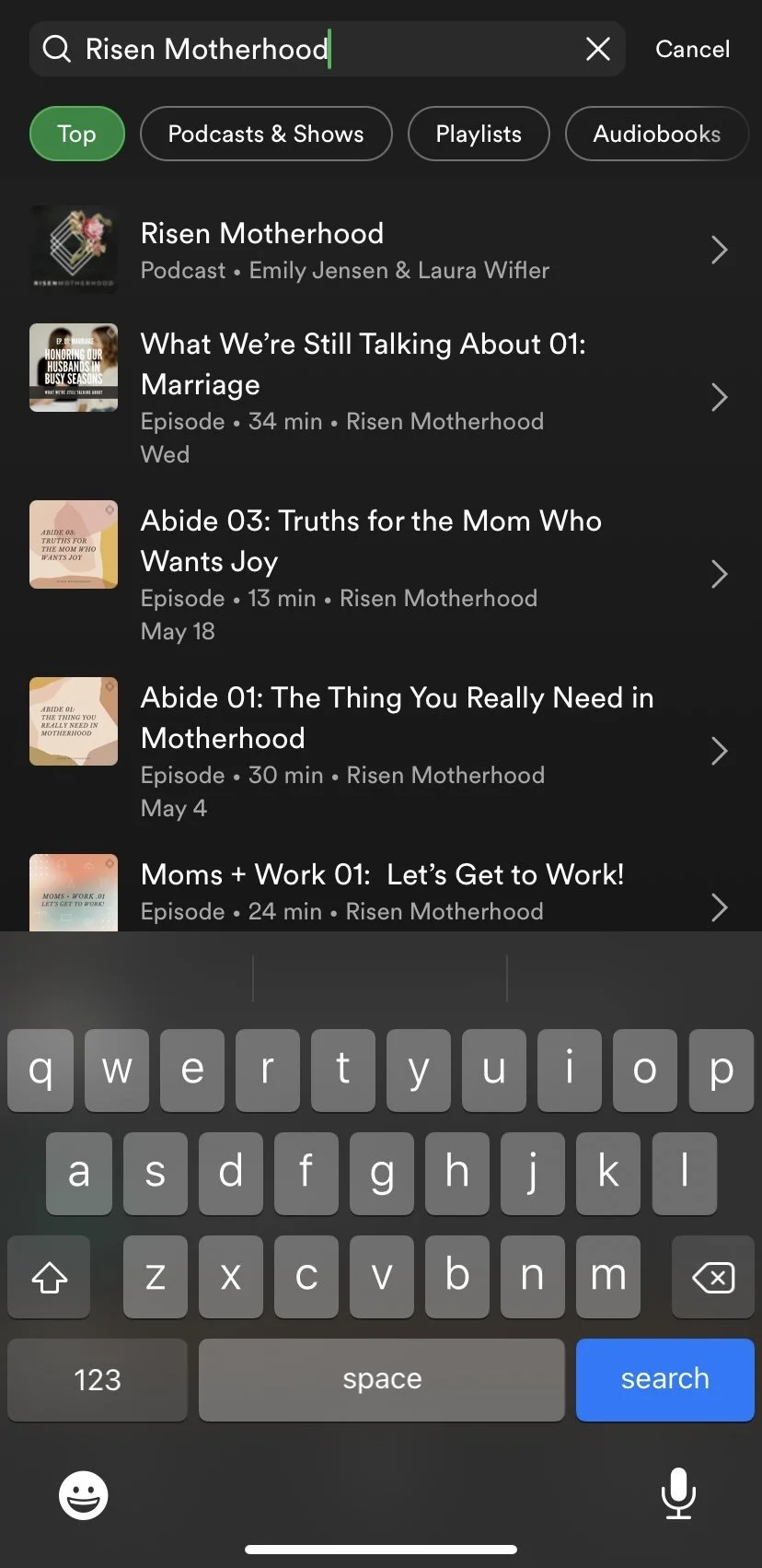 Once you’ve opened the Apple Podcasts app, tap the "Search" button - it’s the large magnifying glass at the bottom right. Then search for Risen Motherhood in the search bar at the top.